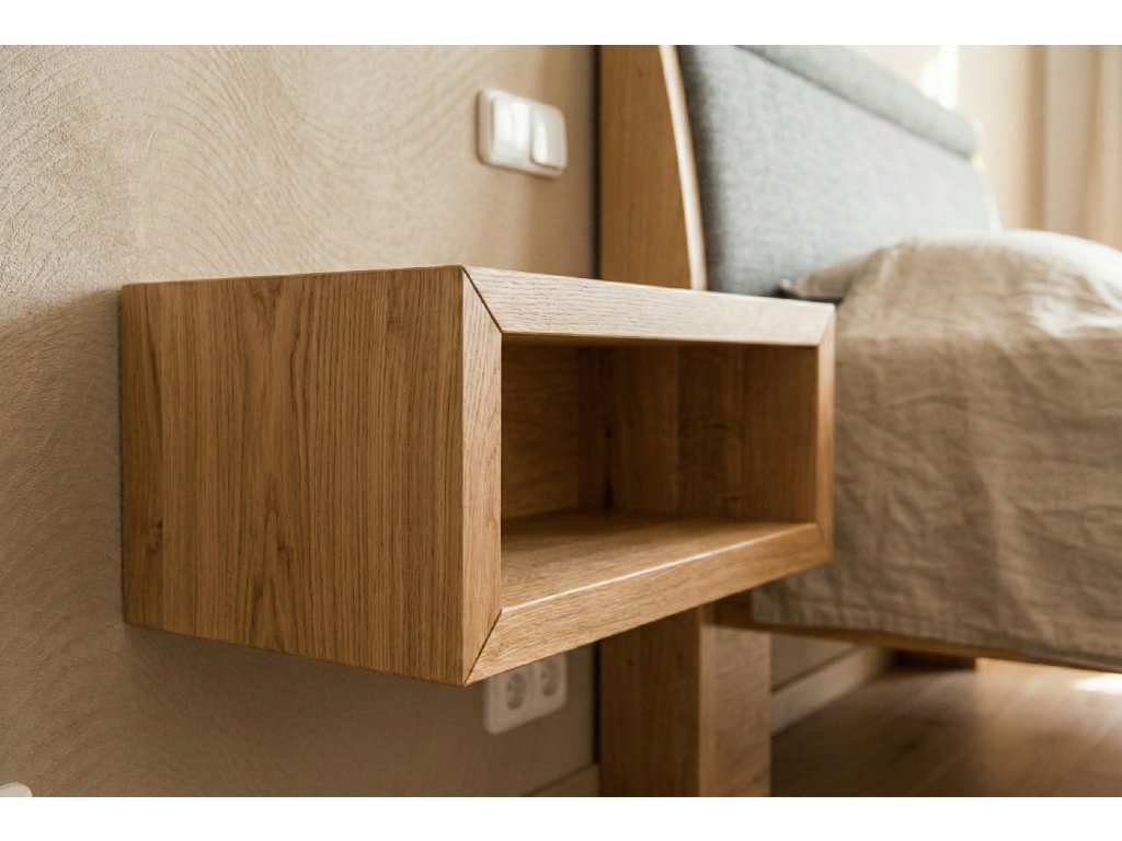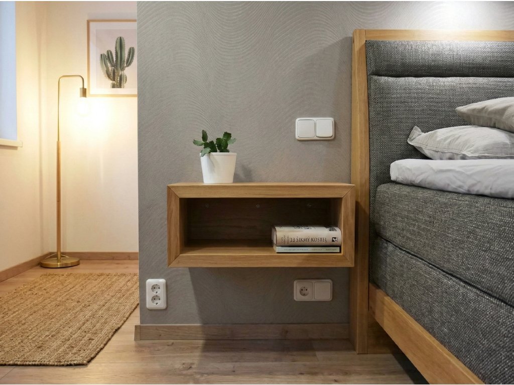 Noční stolek Nika vyrobený s masivního dubového dřeva se vyznačuje čistými liniemi a robustním vzhledem. Je připevněn přímo na zeď, a tím naopak působí odlehčeně. Svým designem vynikne u každé postele.