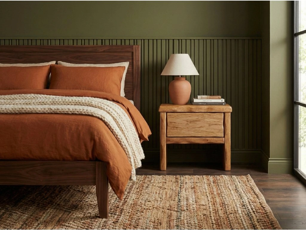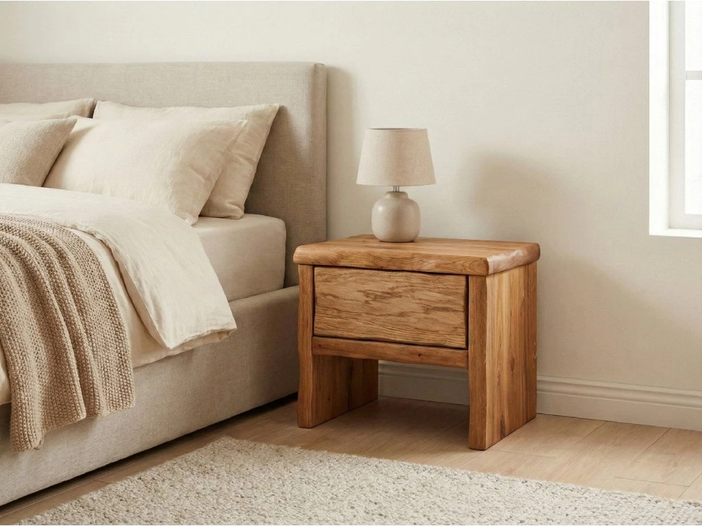 Ke krásné dubové posteli patří i krásný noční stolek s praktickou zásuvkou, který je vyrobený rovněž z dubového dřeva. Čistý design dodá stolku bezúchytkové otvírání TIP-ON značky Blum. Přírodní hrany nočního stolku vyzdvihují ruční řemeslnou práci.