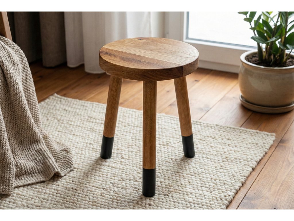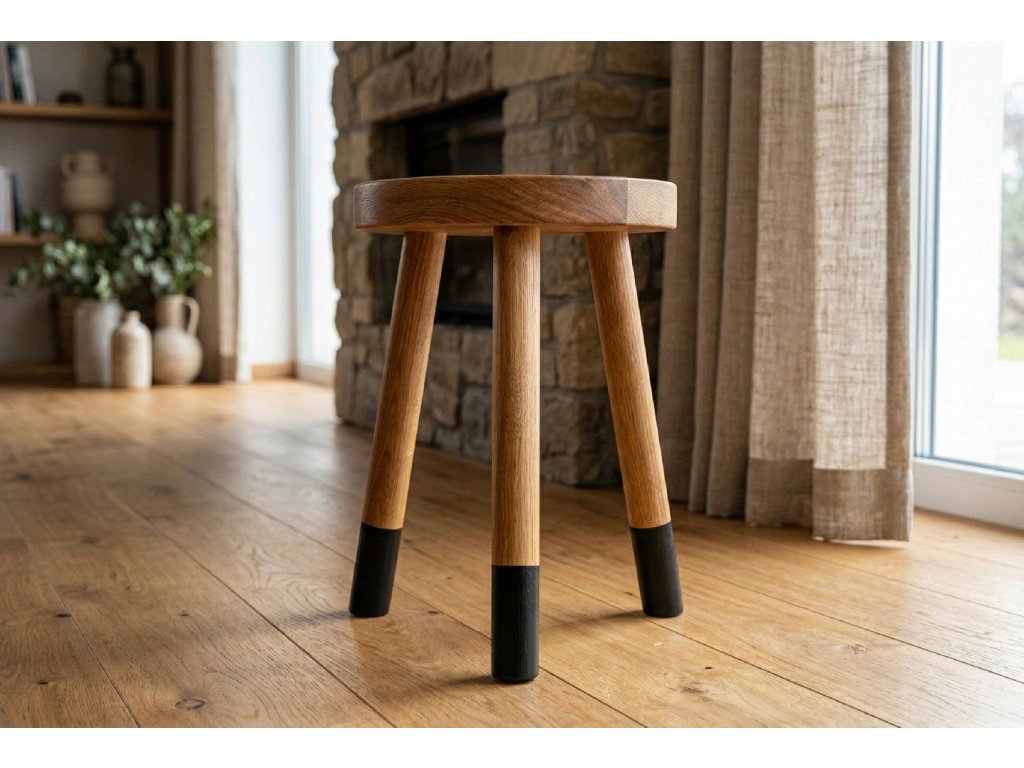 Trojnožka z dubového dřeva může sloužit nejen k sezení, ale i jako odkládací stoleček nebo stojan pod květiny. Černé "ponožky" trojnožce sluší a dávají vyniknout krásné barvě dubového dřeva.
