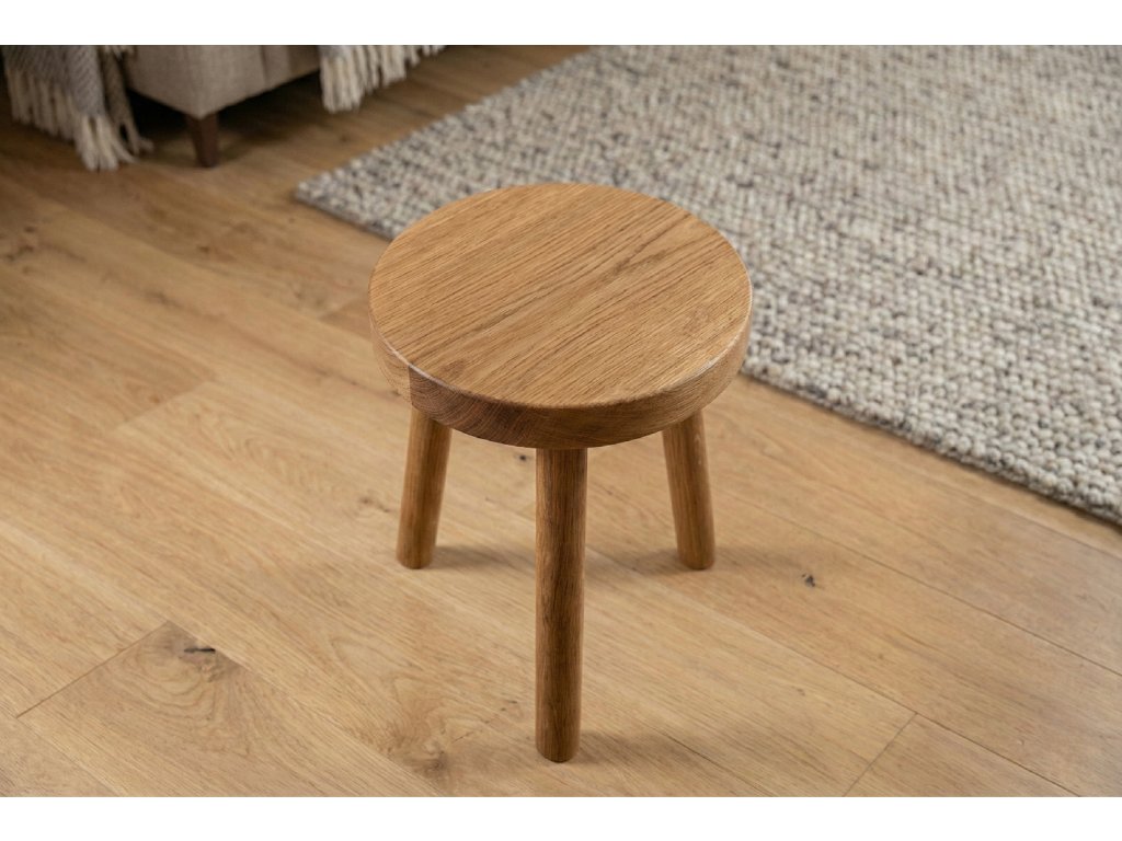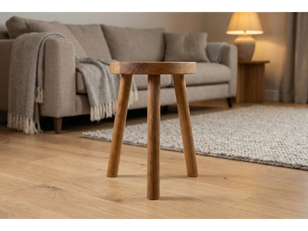 Trojnožka z dubového dřeva může sloužit nejen k sezení, ale i jako odkládací stoleček nebo stojan pod květiny.